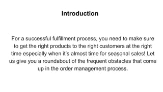 The document outlines key challenges in order management, including processing data, executing bulk orders, inventory planning, system integration, and maintaining customer experiences. It suggests quick fixes such as optimizing inventory for seasonal sales, automating operations to reduce wait times, and integrating systems for better visibility. Unicommerce is highlighted as a leading technology platform in India for managing orders and inventory across multiple channels.