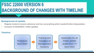 FSSC 22000 version 6 introduces critical updates and mandatory changes effective from April 2023 through March 2025, including the restructuring of food chain categories, enhanced labeling requirements, and revised food defense strategies. The updated standard emphasizes the management of allergens, environmental monitoring, and the establishment of a robust food safety culture while integrating quality control measures and risk assessment for food fraud and contamination prevention. Additional changes address packaging criteria, transport protocols, and communication requirements related to food safety management and certification integrity.