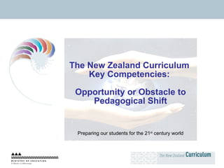 The document discusses the key competencies outlined in the New Zealand curriculum and how they can enable pedagogical shift and prepare students for the 21st century. It provides context on how the competencies are viewed globally and nationally. It also discusses how developing competencies requires a whole-school approach and professional learning communities to support teachers.