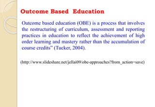 The document discusses key aspects of outcome-based education (OBE) and accreditation. It explains that OBE focuses on achieving high-order learning and mastery rather than just accumulating course credits. Globalization requires education to build learner competencies for a changing workplace. Accreditation criteria under OBE include vision, mission, program outcomes, student performance, curriculum, faculty contributions, facilities, academic support, governance and continuous improvement. Proper implementation of OBE requires defining program outcomes, course outcomes, assessment tools, and mapping the relationship between courses and outcomes.