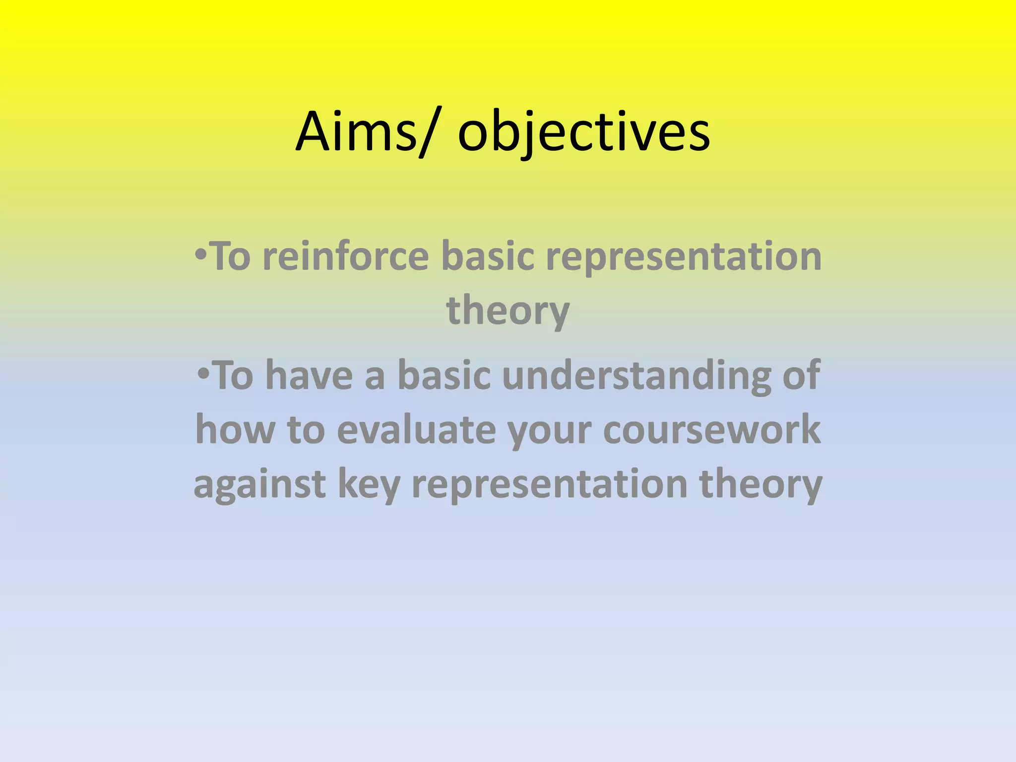 This document provides an overview of key concepts in representation theory including ideology, stereotypes, and how representations are encoded to reinforce dominant views. It discusses theorists like Karl Marx who believed ideology is imposed from dominant groups, and Laura Mulvey's concept of the male gaze which objectifies women. The document also covers David Gauntlett's view that gender roles are more complex today and identities are constructed. It provides questions researchers should ask when analyzing media representations and suggests representation is meant to help audiences make sense of messages.