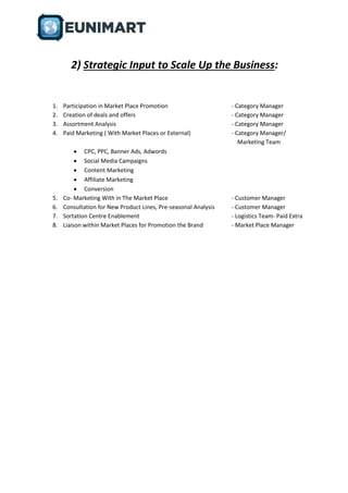 Eunimart provides end-to-end ecommerce services including daily operations like catalog management, pricing analysis, and order fulfillment as well as strategic services like paid marketing, co-marketing, and new product consultation. Its technology platform offers centralized inventory management, order management, smart logistics aggregation, global payments, and intelligent tools for pricing, content, inventory, and portfolio analysis.