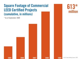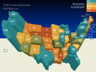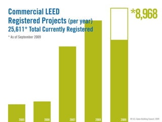 The document discusses key drivers and trends in the green construction industry, emphasizing the importance of energy efficiency and sustainable practices in building. It outlines the economic growth of green construction, projected to reach $140 billion by 2013, and describes the benefits such as reduced energy use and higher property values. Additionally, it highlights legislative efforts and standards aimed at reducing environmental impacts and improving building performance.