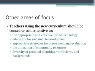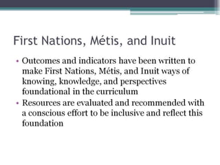 Evidence of the common curricula framework Subject specific goals Grade specific outcomes and indicators Throughlines First Nations, Metis and Inuit