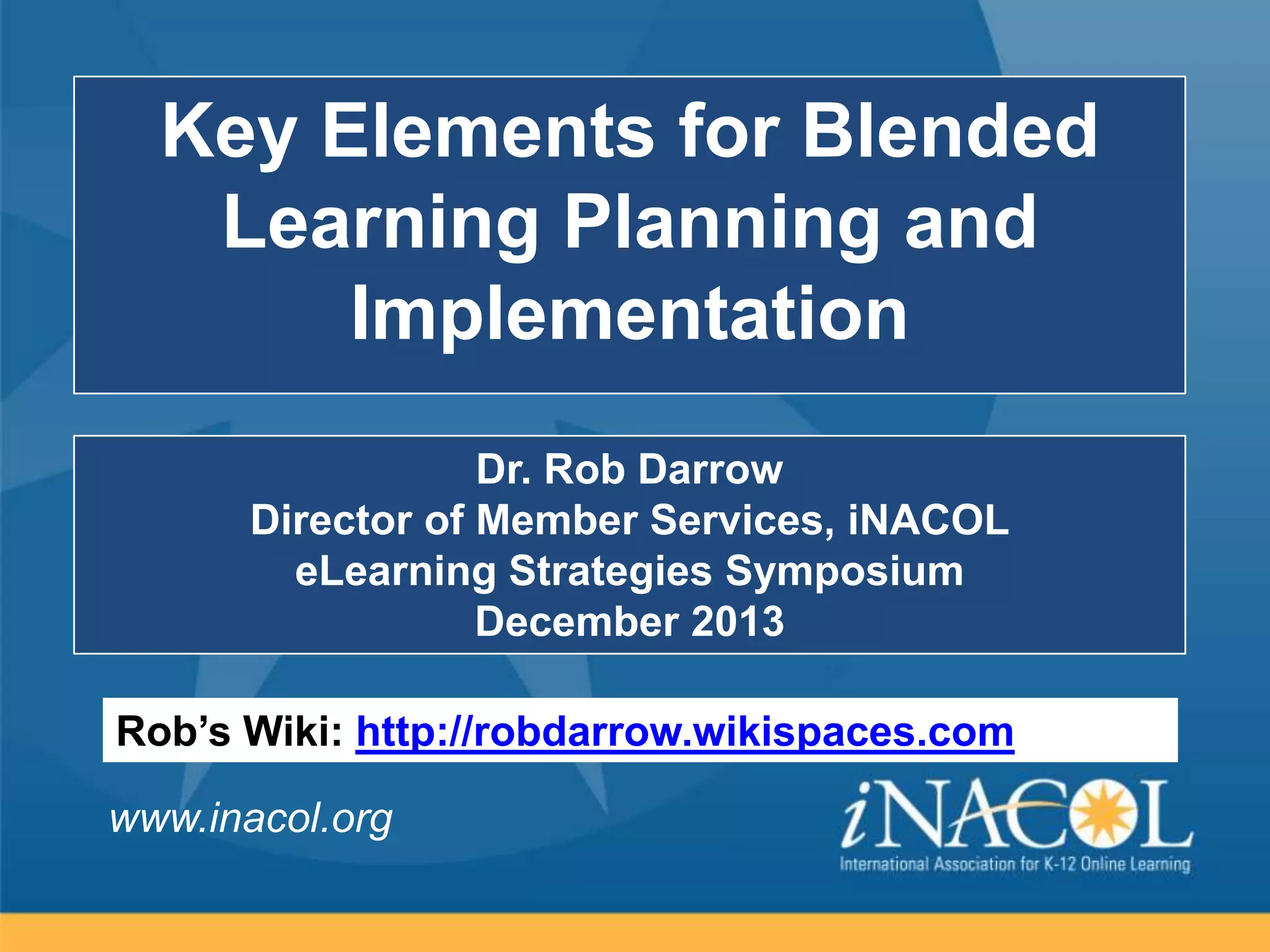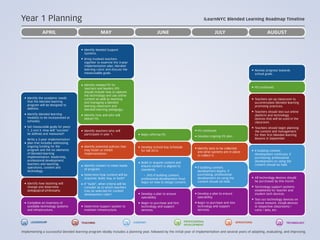 The document outlines key elements and promising practices for planning and implementing blended learning programs in K-12 education. It emphasizes the importance of leadership, professional development, teaching practices, operational systems, content, and technology in creating a successful blended learning environment. The goal is to personalize learning, improve student engagement, and ultimately ensure students are college and career ready.