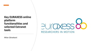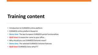 This document provides an overview and demonstration of the key features and functionalities of the EURAXESS online platform and Extranet tools. It begins with an introduction to the training content which will cover the EURAXESS online platform blueprint, demonstrations of the European EURAXESS portal functionalities and selected EURAXESS Extranet features, and quizzes. It then describes what the EURAXESS online platform is, including that it is a single point of access for researchers, organizations, and staff to resources like jobs, funding, hosting opportunities, and career development tools. It also notes user statistics. The document then demonstrates some of the European EURAXESS portal's functionalities and holds a quiz