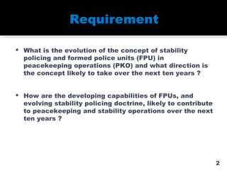 Formed police units (FPUs) are playing an increasingly important role in peacekeeping operations (PKOs) and stability operations. Over the next ten years, FPUs will likely make up 50-70% of UN police components and take on expanded security roles like protecting IDP camps and counseling on gender issues. The Center of Excellence for Stability Police Units (COESPU) will likely continue developing FPU doctrine and capabilities focused on African PKOs. Effective coordination will also become more crucial for mission success, informed by lessons from past operations. The African Standby Force may be the first inter-governmental organization to fully adopt the new FPU doctrine but is unlikely to engage in PKOs in the next decade.