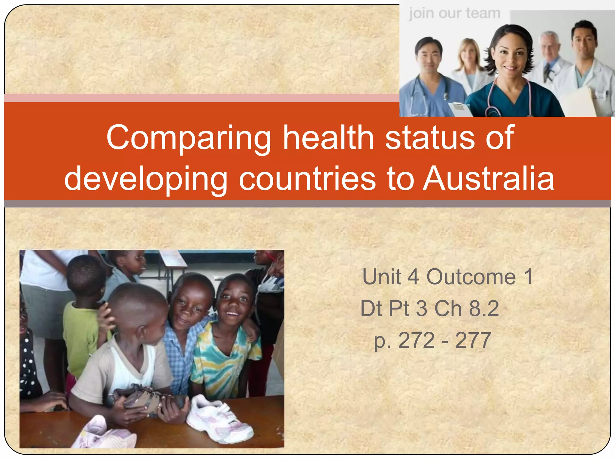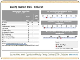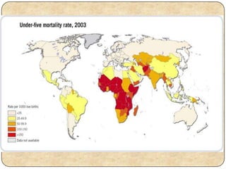 Australia has higher life expectancy, lower mortality rates, and lower burden of disease compared to developing countries. Life expectancy in Australia is 79 years for males and 84 years for females, while in Africa it is only 50 years for males and 52 years for females. Mortality rates for children under 5 years old (under-5 mortality rate) and infants (infant mortality rate) are much lower in Australia at 6 and 5 per 1,000 live births respectively, compared to over 250 for under-5 mortality in Sierra Leone. Leading causes of death in developing countries include communicable diseases, malaria, and HIV/AIDS, while non-communicable diseases dominate in Australia. Maternal mortality is also much higher in developing countries