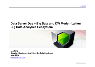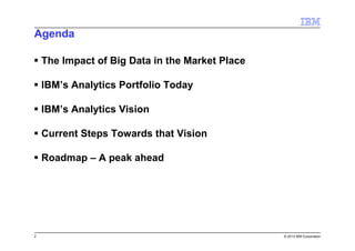 This document discusses IBM's analytics portfolio and vision. It provides an overview of Big Data trends, how Watson has evolved to be faster and smaller, and the need for real-time analytics. It also discusses IBM's approach to Big Data challenges like volume, velocity, variety and veracity. The document outlines IBM's analytics platform capabilities including accelerators, information integration, governance, and Hadoop solutions. It highlights the evolution of IBM Netezza and DB2 in analytics and how IBM is committed to helping clients succeed with Big Data.