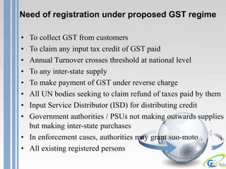 - Registration under GST is required for businesses with an annual turnover over the threshold limit, those making inter-state supplies, or those seeking input tax credits. Registration involves filing an application within 30 days to obtain a state-specific 15-digit GST identification number. Existing registrants will be migrated to the new system and provided with preliminary GSTINs based on available data.