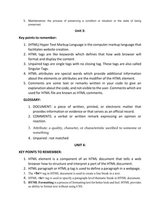 Unit 1 provides an overview of key concepts related to web hosting, the world wide web, web standards, browsers, and search engines. Key terms are defined, including research, identifiers, hypertext, IP addresses, and hosting. Unit 2 discusses web development and the importance of websites for connecting people and sharing information freely. Key terms defined include purpose, communication, specifications, and contemporary. Unit 3 covers HTML tags, attributes, comments, and their uses in structuring web pages.