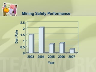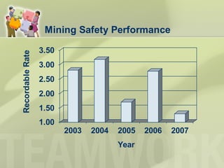 The document outlines safety initiatives and performance at multiple mining sites. It discusses milestones achieved, including periods without injuries. Metrics show improvements in injury rates from the prior year. First quarter accomplishments included training programs. Second quarter activities focused on continuous safety process improvements through strategies like communication, leadership involvement, and standardized practices.
