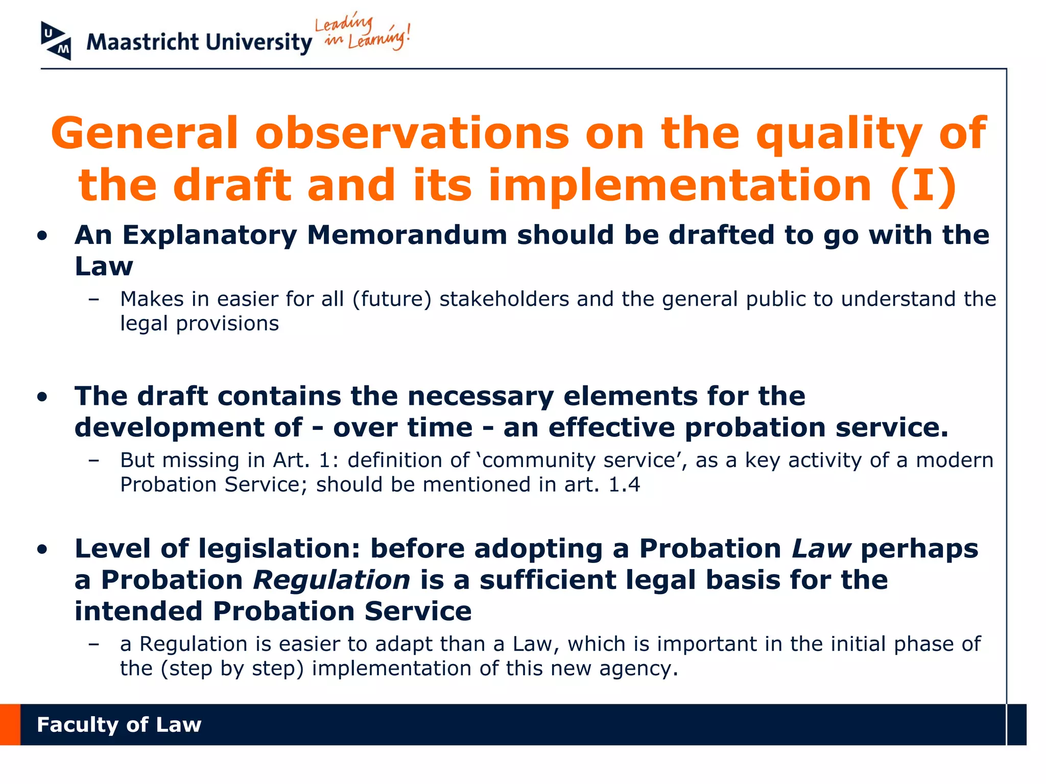 The document discusses the essential features and observations regarding the draft law for a modern probation service in the Netherlands. It highlights the need for clear definitions, the organizational structure, the role of the probation service in various phases of the criminal process, and identifies gaps in the draft regarding tasks and responsibilities. Recommendations include adding community service definitions, providing an explanatory memorandum, and ensuring integration with existing legal frameworks.