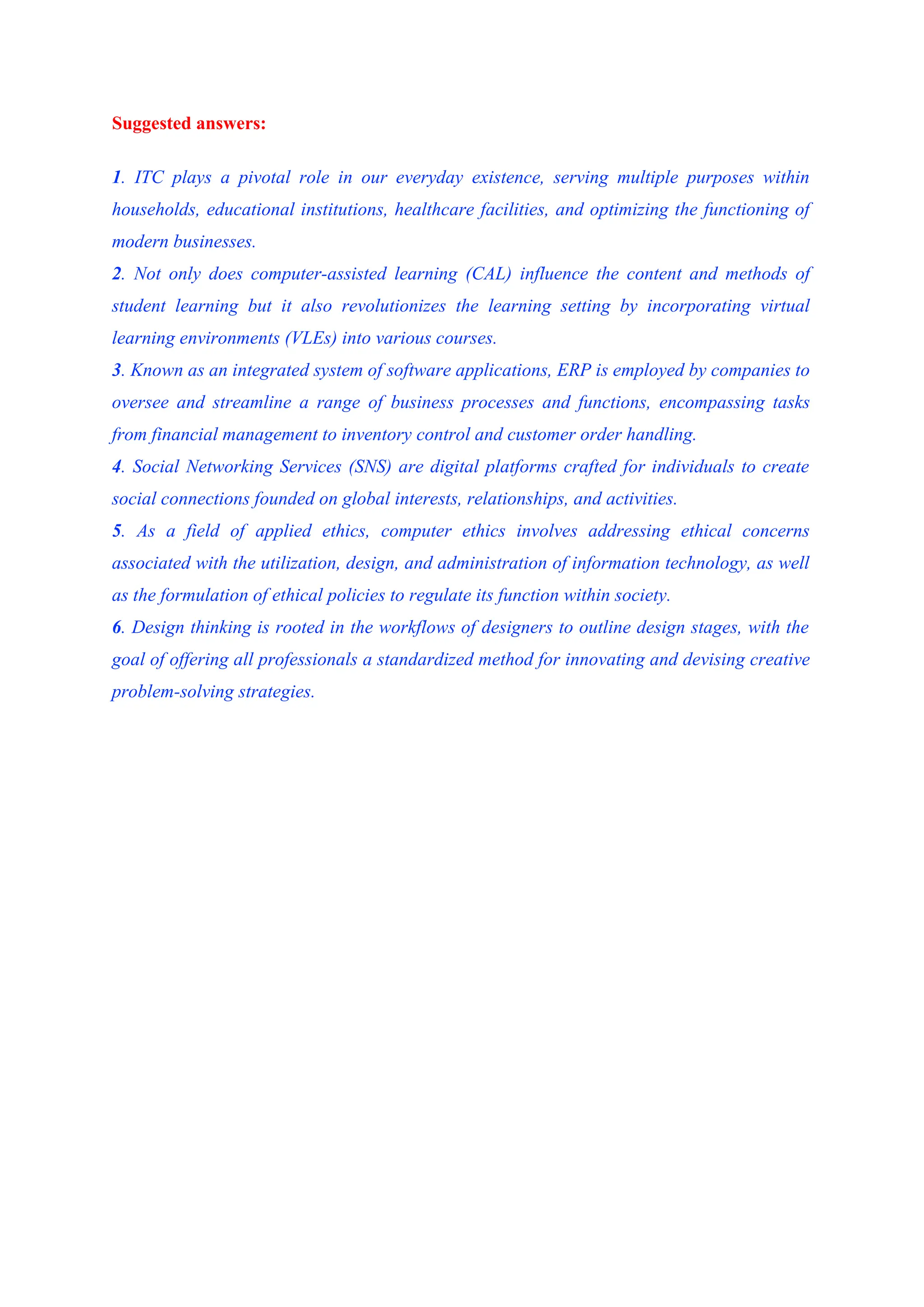 The document discusses the critical functions of information technology (ITC) in various sectors, including its use in education through computer-assisted learning and virtual learning environments. It highlights the application of enterprise resource planning (ERP) systems in businesses for efficient management of processes and introduces the role of social networking services in fostering social connections. Additionally, it touches upon computer ethics, addressing the ethical concerns surrounding information technology, and emphasizes design thinking as a structured approach for innovation and problem-solving.