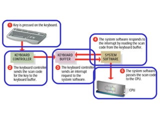 A standard keyboard has around 110 keys in a QWERTY layout. It can produce characters through pressing keys which the keyboard controller detects and sends to the computer via an interrupt. A computer mouse is a common input device that was invented in 1968 and uses optical, mechanical, or other methods to track movement and send it to the computer.
