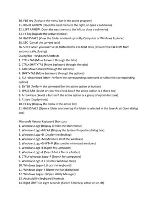 The document lists over 100 keyboard shortcuts for various applications in Windows, including shortcuts for copying, pasting, undoing actions, navigating text, and more. It also includes shortcuts for dialog boxes, the Windows start menu, Internet Explorer, Remote Desktop Connection, and other programs. Many involve using CTRL, ALT, SHIFT, or FN keys along with other keys to perform common commands across different applications.