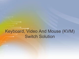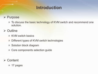The document discusses KVM switch technologies that allow multiple computers to be accessed from a single keyboard, mouse and monitor. It analyzes different types of KVM switches including analog and digital and recommends components like video buffers, amplifiers, switches and processors that can be used to build a KVM switch solution. Key aspects covered include types of KVM switches, applications, technologies, component selection guides and solutions.