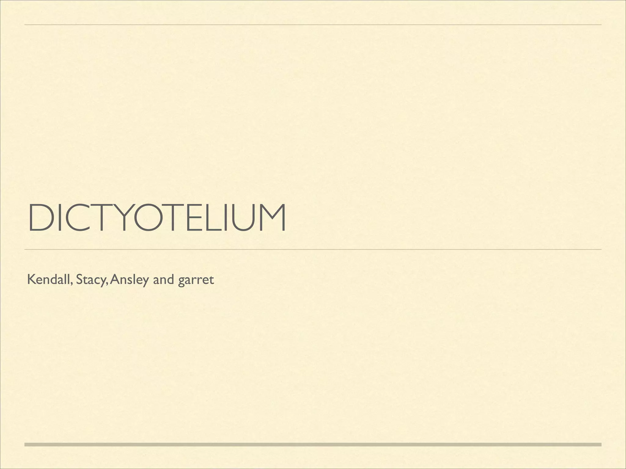 Dictyotelium is a genus of social amoebae or slime molds that feeds on bacteria like E. coli. It has no cell wall, lives in moist environments with decaying vegetation, and can exist as both single-celled and multicellular organisms. As a eukaryote, it begins life as a spore and includes three main species: Dictyotelium discoideum, Dictyotelium caveatum, and Dictyotelium purpureum.