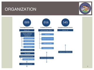 The document outlines four key administrative goals for Cook County: fiscal responsibility, innovative leadership, transparency and accountability, and improved services. It highlights the budgetary challenges, noting that the Bureau of Technology constitutes only 19% of IT personnel and countywide IT costs exceed $150 million. Additionally, it discusses strategic initiatives for 2012-2014, including improvements in timekeeping, ERP systems, and collaborative projects.