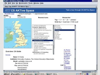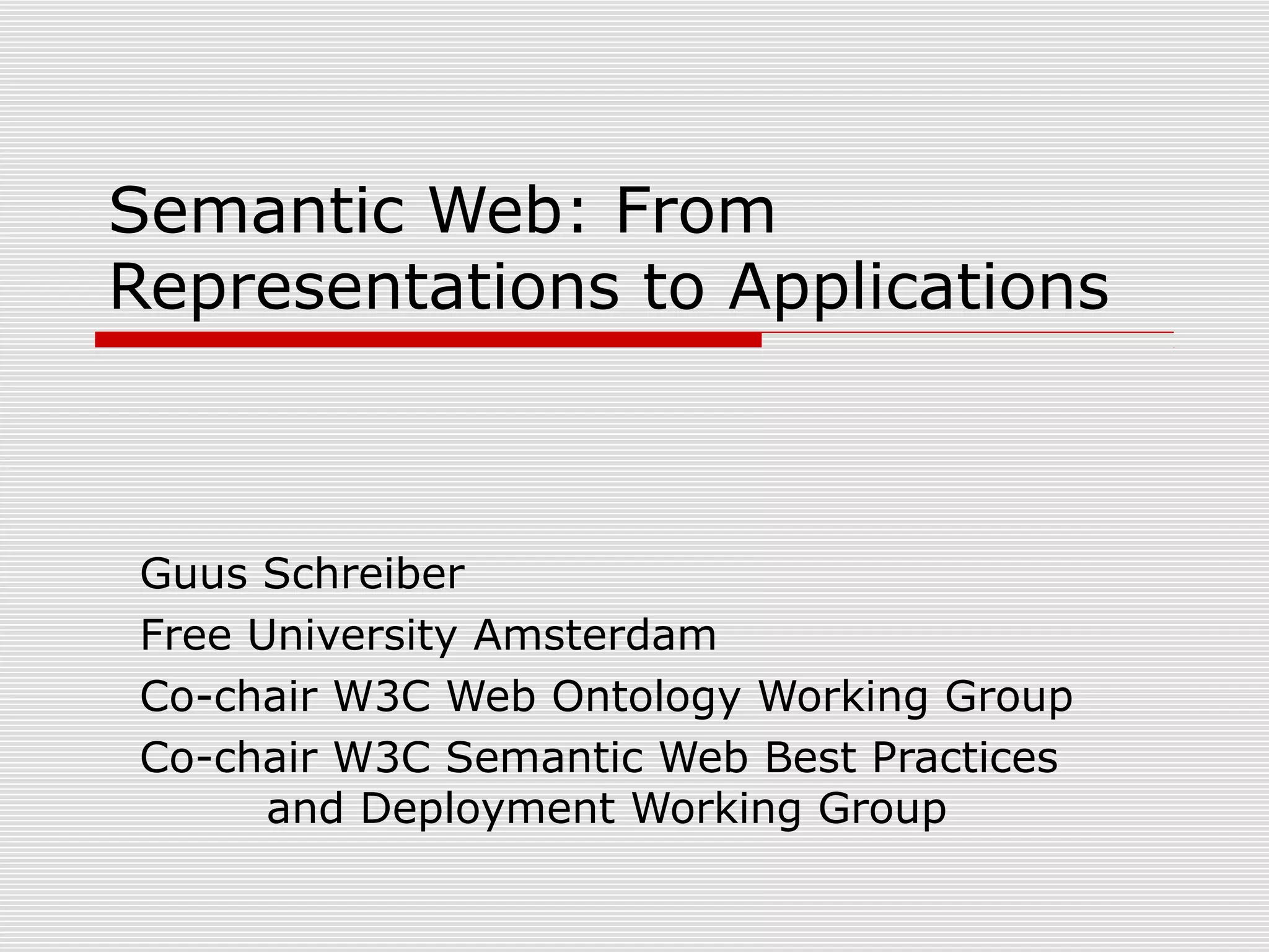 This document discusses semantic web representations and applications. It provides an overview of the W3C Web Ontology Working Group and Semantic Web Best Practices and Deployment Working Group, including their goals and key issues addressed. Examples of semantic web applications are also described, such as using ontologies to integrate information from heterogeneous cultural heritage sources.