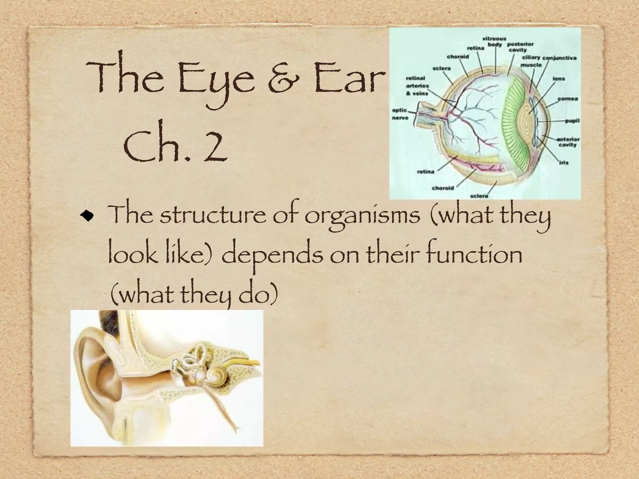 The document discusses how the structure of organisms depends on their function, and how vision requires reflection, refraction, and light traveling in straight lines. It specifically mentions that lenses focus or spread out light waves, and that rod cells detect light levels while cone cells detect color.