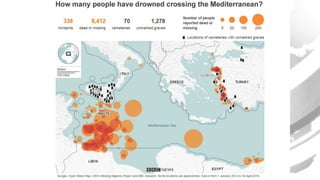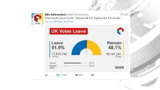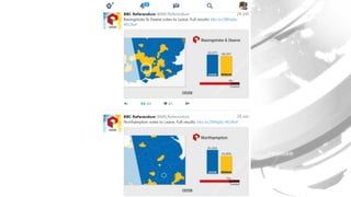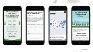 The document discusses the approach to visual journalism at the BBC, emphasizing principles such as distinctiveness, liveliness, and understanding, particularly in mobile and social contexts. It highlights the integration of animations and cross-platform strategies to enhance journalism's impact. Additionally, it references the Great British Class Calculator and its significant audience engagement.