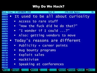 The document discusses reasons for hacking and target selection in hacking. It notes that reasons for hacking have changed over time from curiosity to career goals and public recognition. When selecting targets, it recommends choosing things that genuinely interest you rather than just following trends, and that bigger targets tend to have more code and vulnerabilities but are also more challenging. The purpose of hacking should guide the methods used, such as automation for bug bounties or reliability testing for exploit sales.