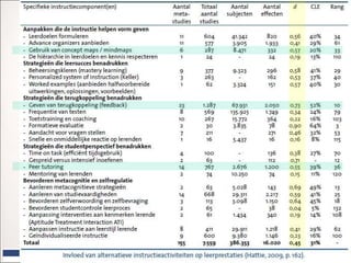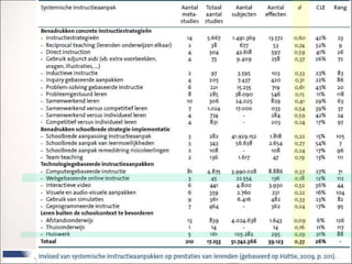 Feedback Hattie: Feedback d = .73 Types effectieve feedback: Cues geven ( d = 1.10) Informatie geven over kwaliteit van gedrag ( d = .95) Prestaties bekrachtigen ( d = .94) Video of audio feedback geven ( d = .64) Computer gebaseerde feedback ( d = .52) Terug verwijzen naar leerdoelen bij feedback ( d = .46) Evaluatieve feedback door andere lln. laten geven ( d = .42)