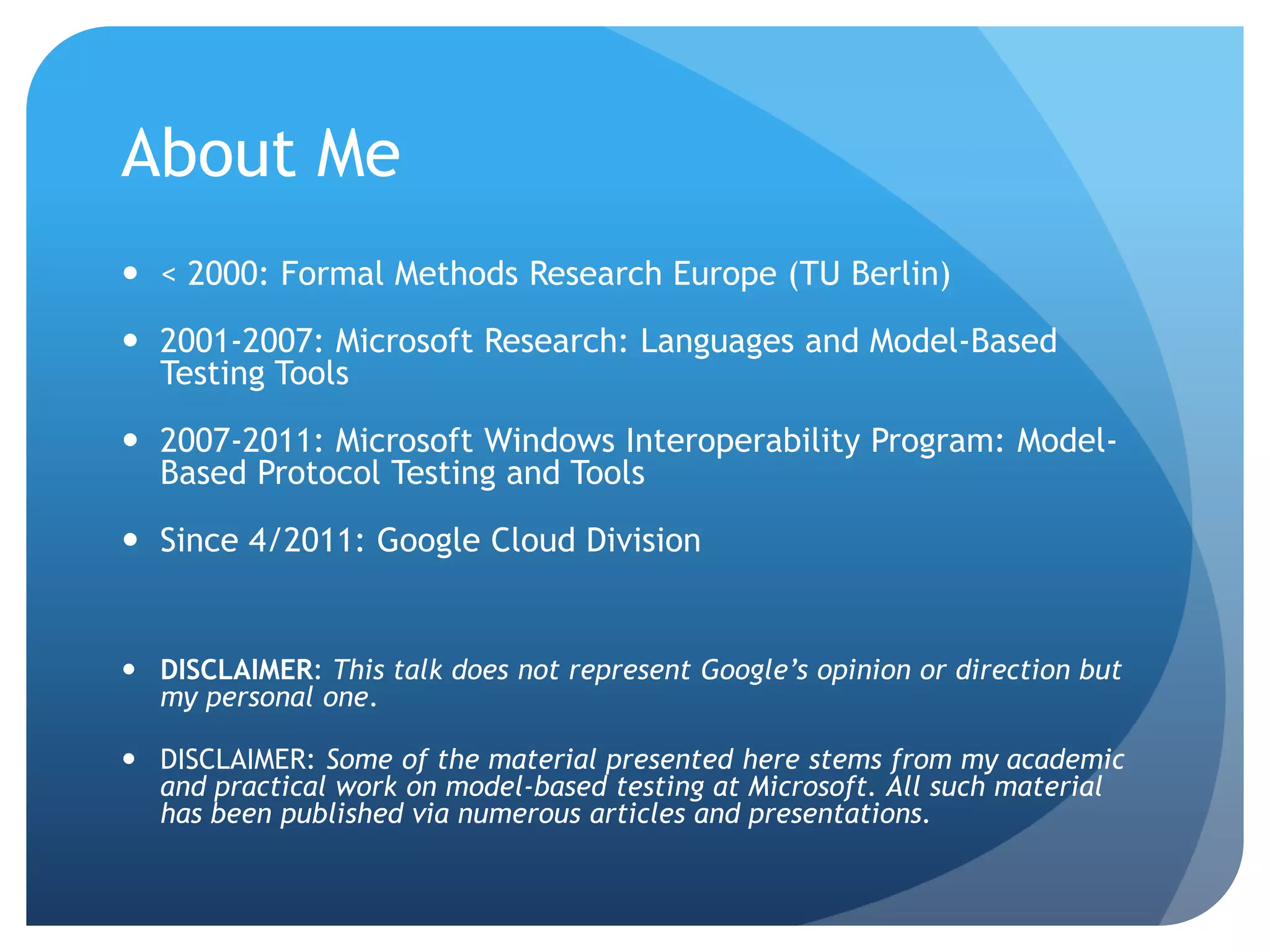 The document discusses model-based testing (MBT), covering its historical development, theoretical foundations, and practical application in organizations like Microsoft and Google. It emphasizes the consolidation of MBT theory, the complexity of necessary technology for industrial adoption, and lessons learned regarding test selection and tooling challenges. Additionally, it explores new opportunities for MBT in cloud environments, highlighting both the promise and ongoing challenges in practice.