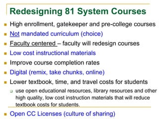 This document discusses how digital technologies and networking are changing higher education. It argues that capstone graduation requirements should prepare students for jobs that don't yet exist using technologies not invented to solve unknown problems. Specifically, it suggests that capstones could require students to (1) engage participatory tools like wikis and social networks, (2) take an online or hybrid course, and (3) contribute to or evaluate open educational resources. The document also discusses trends like growing online enrollments, open educational resources that can lower costs, and challenges higher education faces if it does not change to leverage the affordances of digital networks.