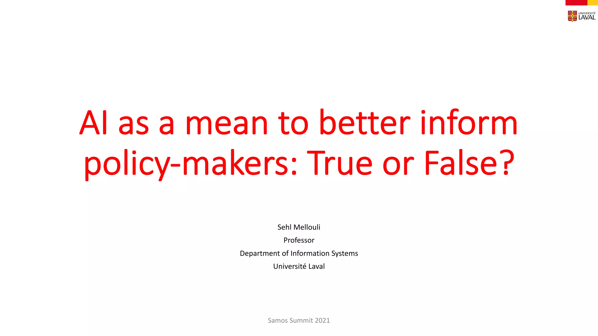 This document summarizes a presentation on using AI to better inform policymakers. It discusses how social media is increasingly used to provide feedback on government services and the challenges this data poses. Specifically, it notes that social media data contains both structured and unstructured elements. It also presents two case studies, where AI was used to analyze social media posts about public services. However, the results varied between groups analyzing the same data. This highlights the difficulty in reliably interpreting social media for policymaking. The discussion advocates for more research on building ethical AI solutions and ensuring data analysis results are representative. The next steps focus on developing theories around using AI in government and addressing issues like reliability and data representation.