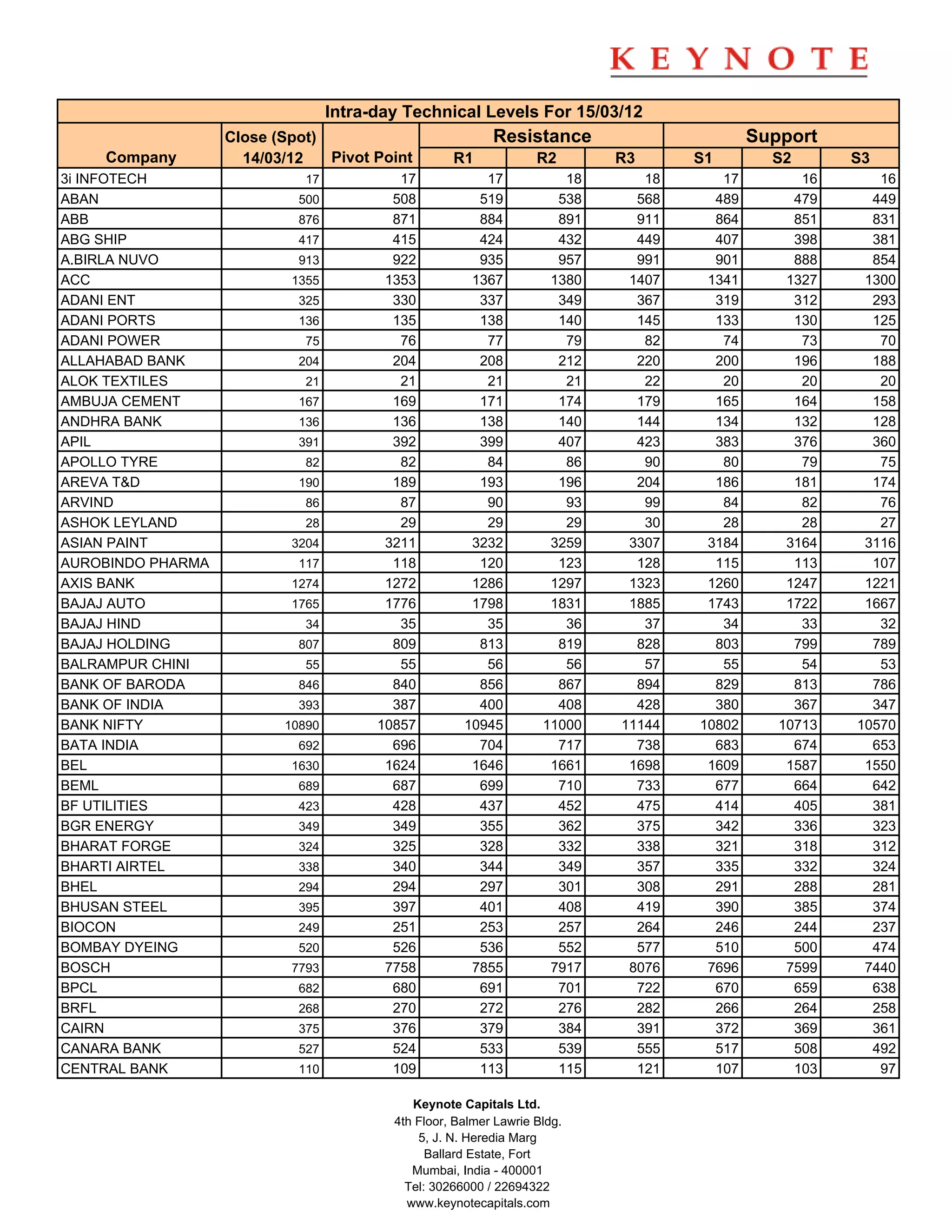 The document provides the intra-day technical levels for various companies for March 15, 2012. It lists the company name, previous day's closing price, pivot point, and resistance and support levels R1-R3 and S1-S3. There are over 50 companies listed with their corresponding technical analysis indicators to identify intra-day price movement opportunities.