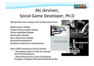 The document discusses the distinctions between actionable and emancipatory research in game design, emphasizing the practical needs of designers in commercial contexts versus theoretical knowledge. It highlights the importance of aligning academic research with the realities of game development, advocating for research that informs design practices and is relevant to stakeholders. The speaker, Aki Järvinen, calls for a re-evaluation of how research can effectively contribute to game design and management, implying that research should aim for actionable results to be considered valuable in the industry.