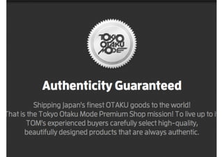 This document summarizes the founding and growth of TOM, an e-commerce company focused on Japanese pop culture. It describes how TOM was founded in 2012 in Silicon Valley by Nao Kodaka and others. They grew the business through networking at events like MIT Media Lab and raising funds. TOM built engagement by allowing users to log in through Facebook. This helped attract and engage a large global fan base for Japanese animation, comics, games and music outside of Japan. The company now has over 5.6 million fans on Facebook and fulfills orders to over 100 countries from shipping centers in Tokyo. The founders' dream was to create a global vertical e-commerce brand focused on Japanese media f