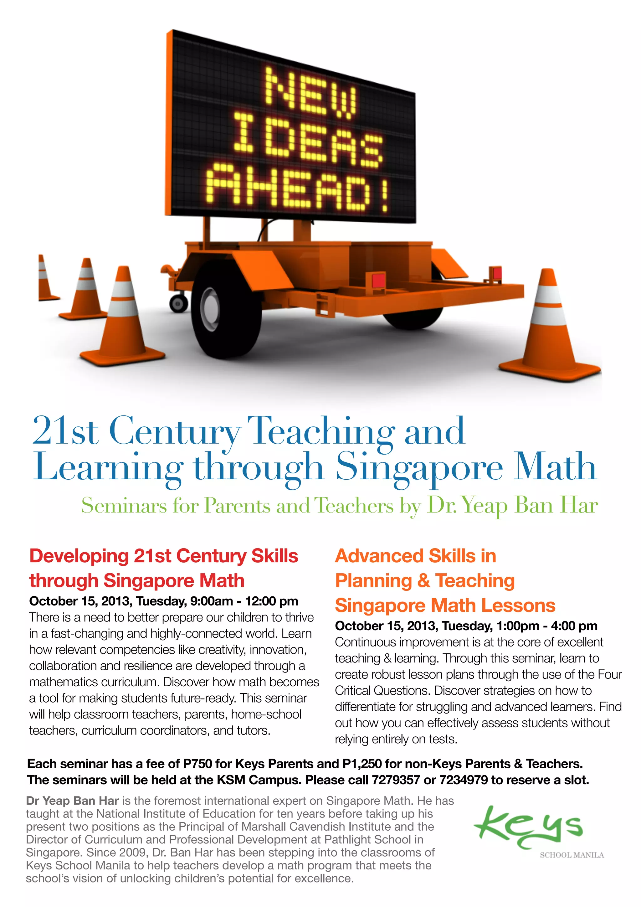 This document advertises and provides information about upcoming seminars on developing 21st century skills through Singapore Math. The first seminar on October 15 from 9am to 12pm will discuss how competencies like creativity, innovation, collaboration and resilience are developed through a math curriculum. The second seminar on October 15 from 1pm to 4pm will focus on creating robust lesson plans, differentiating instruction, and effective assessment without relying entirely on tests. Both seminars aim to help teachers, parents, and tutors. Background information is provided on the seminar leader, Dr. Yeap Ban Har, and registration details.