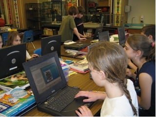 This document provides a tour of a 5th grade classroom that has integrated various technologies into the curriculum. It describes how students use technologies like digital cameras, podcasting, websites, and online games to support learning in subjects like science, math, and history. Collaboration projects allow students to communicate with peers in other schools. The classroom website facilitates research, communication between school and home, and student sharing of work. Overall, the document shows how pervasive technologies have become for both teaching and student projects in this classroom.