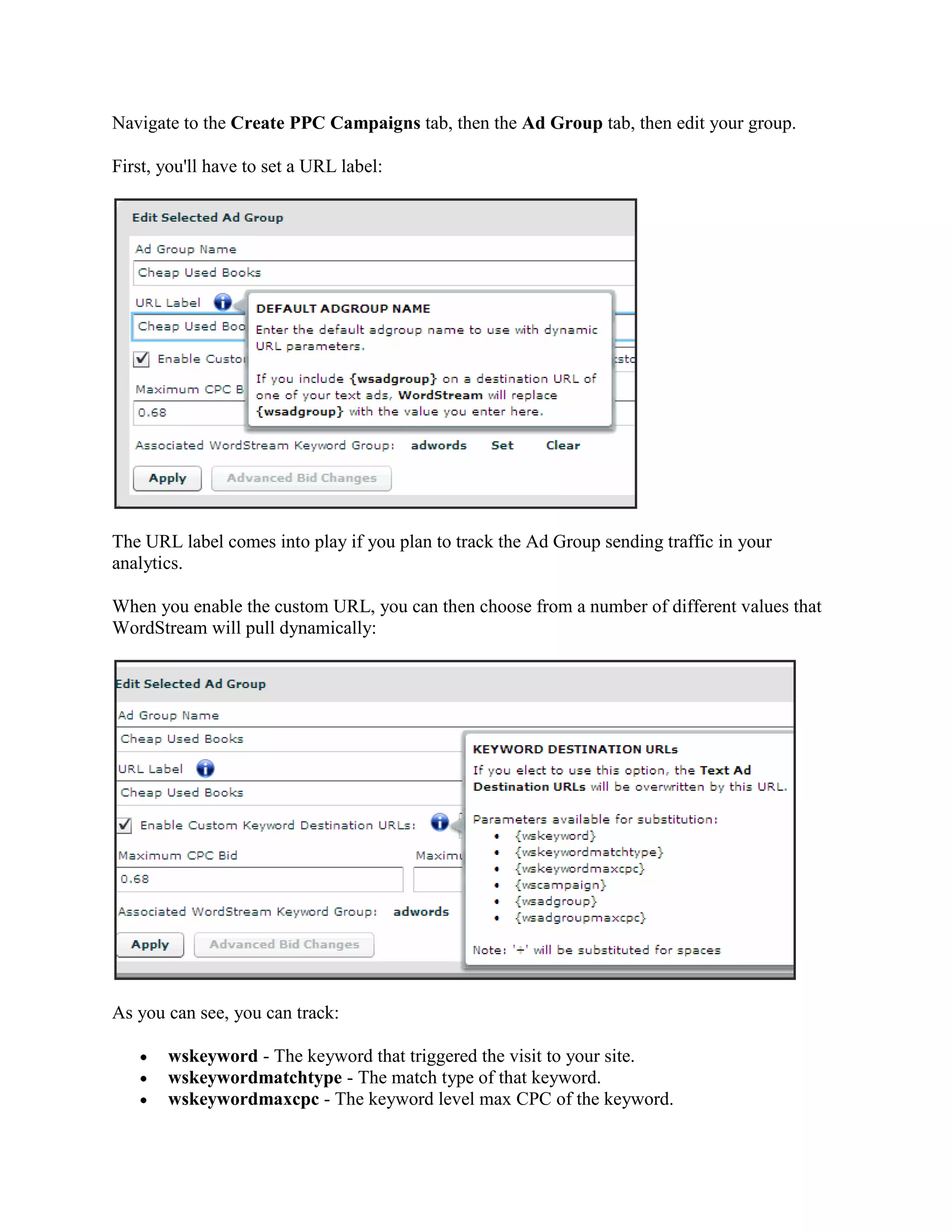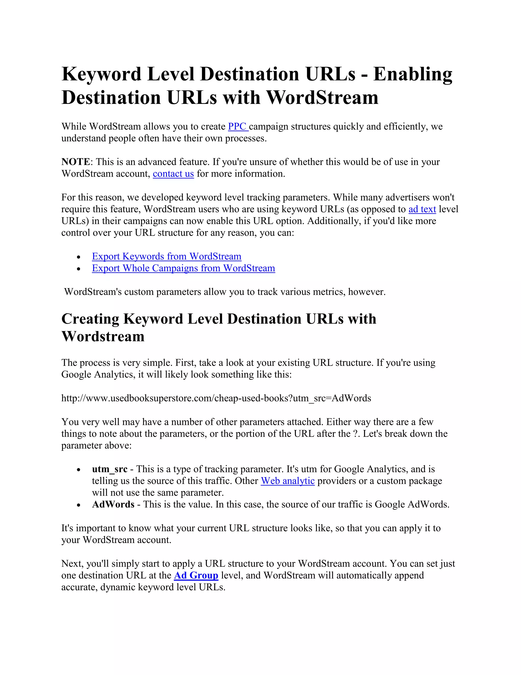 WordStream introduces a feature for creating keyword level destination URLs in PPC campaigns, allowing users greater control over URL structures. Users can dynamically append tracking parameters to URLs based on keyword performance, enabling better analytics integration. For assistance with setting up this feature, users are encouraged to contact their account representative or sign up for a trial.
