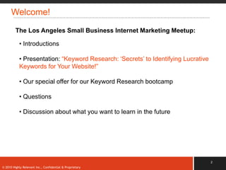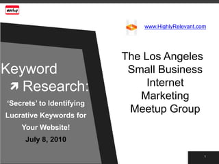 The document discusses keyword research for websites. It defines keywords as the words or phrases people use in search queries. Keyword research identifies lucrative keywords by determining popular search terms related to a target market, whether those searching would spend money, and the level of competition. The document outlines brainstorming keywords, refining lists using tools like Google's AdWords and related search, analyzing search volume and competition levels, and integrating top keywords into a website. The goal is to choose keywords with sufficient search demand but low competition for SEO or PPC campaigns.
