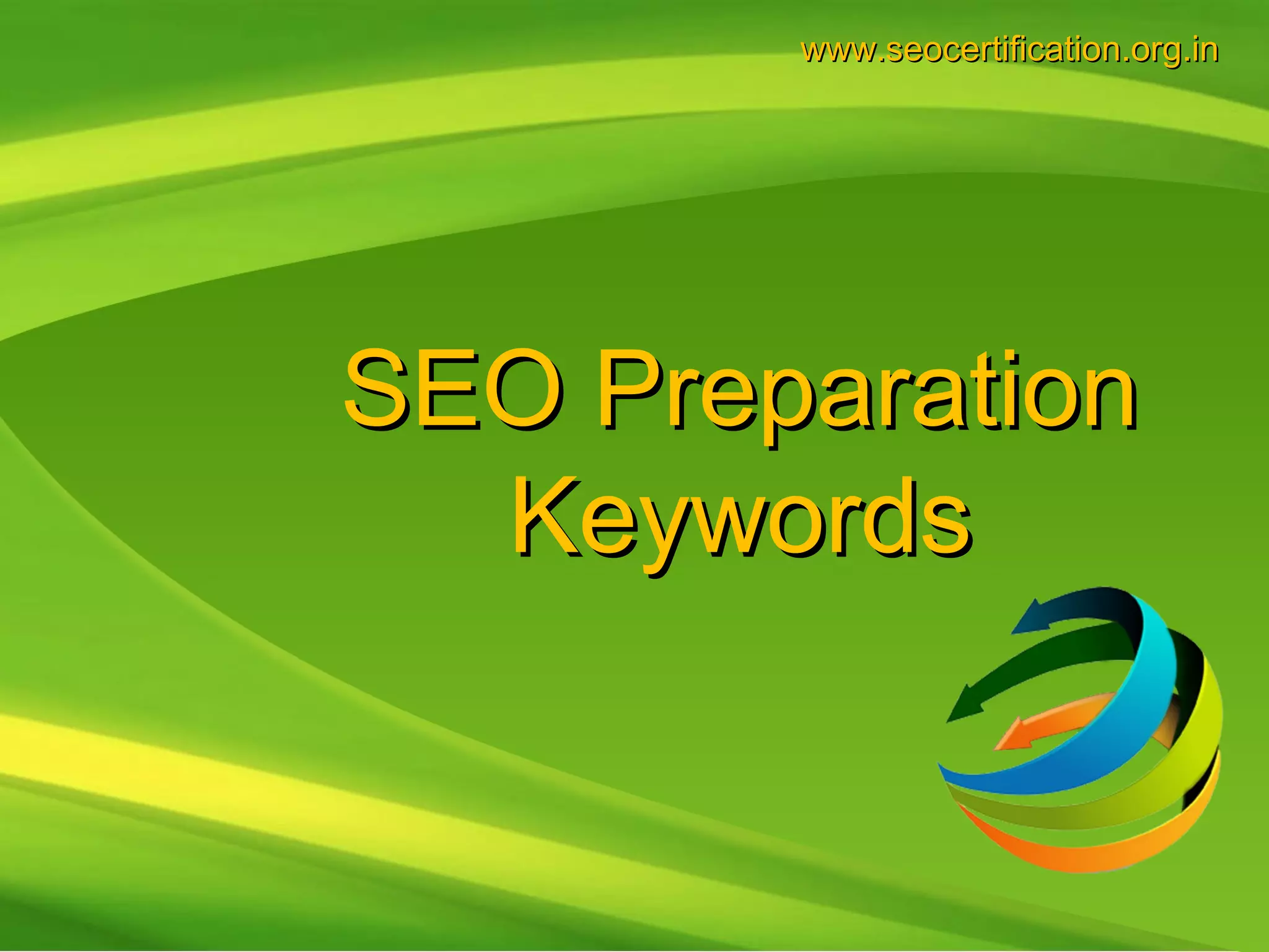 The document provides guidance on selecting keywords for search engine optimization. It recommends defining business goals and determining which keywords and terms visitors use to find a website. A variety of free keyword research tools are listed to help identify relevant keywords based on goals and competitors. The document also provides tips on assessing a website's keywords, indexed pages, inbound links, and competitors to improve search engine rankings.