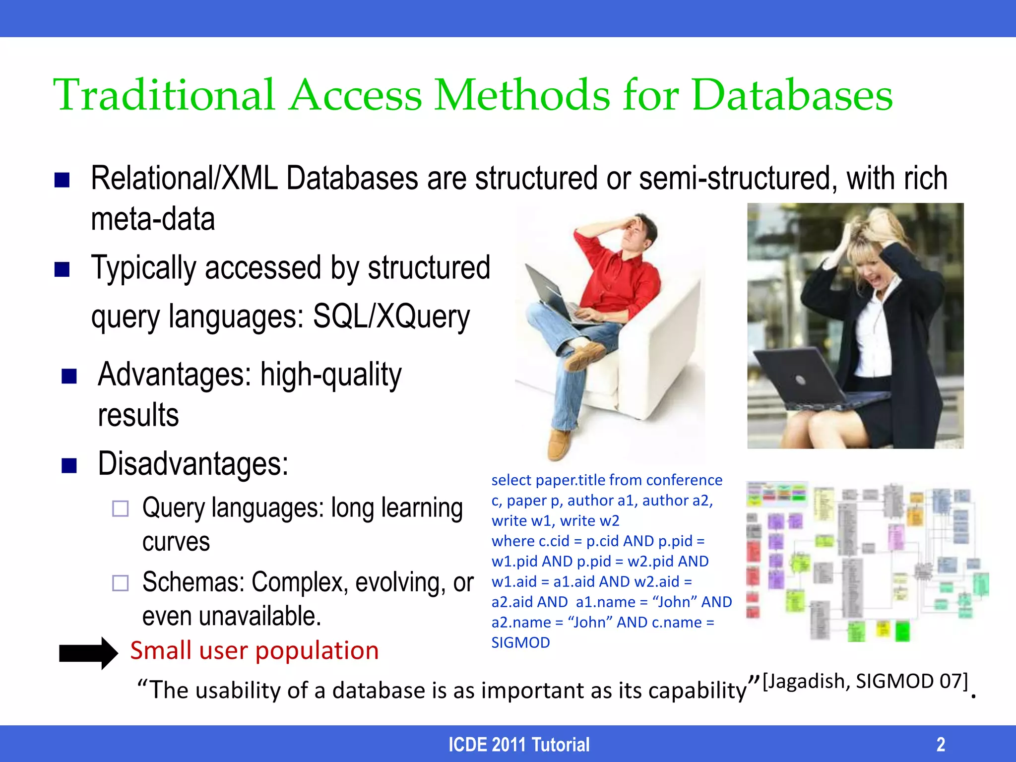 Keyword-based search aims to support searching databases using keywords rather than structured queries. This allows for a large user population but comes with challenges including structural and keyword ambiguity. The tutorial discusses approaches to infer structure from keywords and rank candidate structures and results to provide high-quality answers. Future work includes better handling of keyword ambiguity and more effective result analysis and exploration.