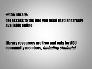 1. The document provides tips for conducting effective database searches at the library, including formulating a research question, using synonyms, limiting searches by information type and subject, and using the 360 Link feature to access full texts across multiple databases.