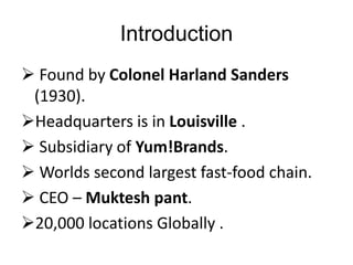 KFC was founded in 1930 by Colonel Harland Sanders and is now a subsidiary of Yum! Brands, with over 20,000 locations worldwide. It entered the Indian market in 1995 and faced various challenges, including protests and competition from multinationals like McDonald's. The company's strengths include strong brand equity and loyal customers, while its weaknesses lie in competition and rising costs of raw materials.