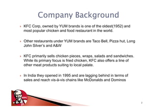 The document discusses KFC's strategy for the Indian market, analyzing their target market, competitors like McDonald's and Domino's Pizza, and conducting a PESTLE, Porter's Five Forces, and competitive matrix analysis. It finds that KFC lags behind competitors in India due to fewer store locations and a less extensive menu. The document recommends KFC expand its store network and customize its menu to local tastes to better compete in the growing Indian fast food market.