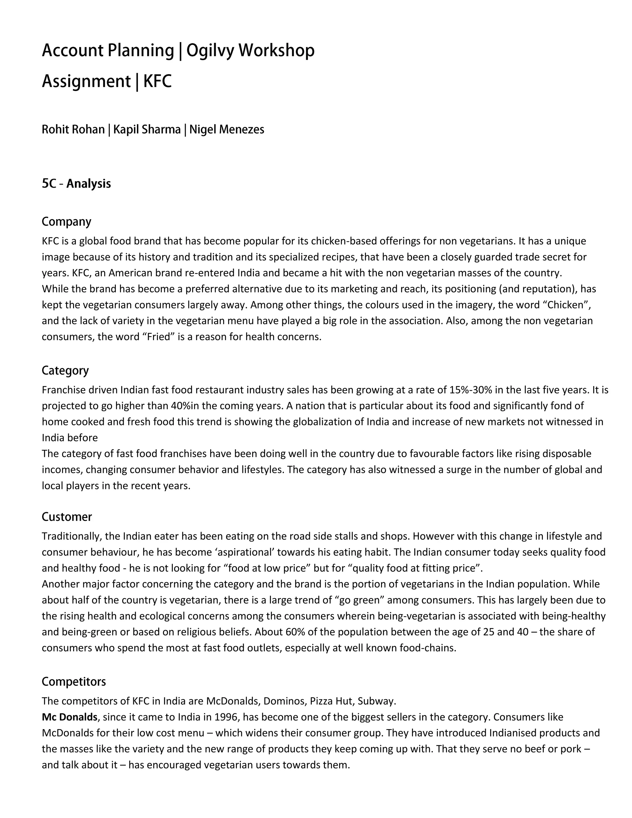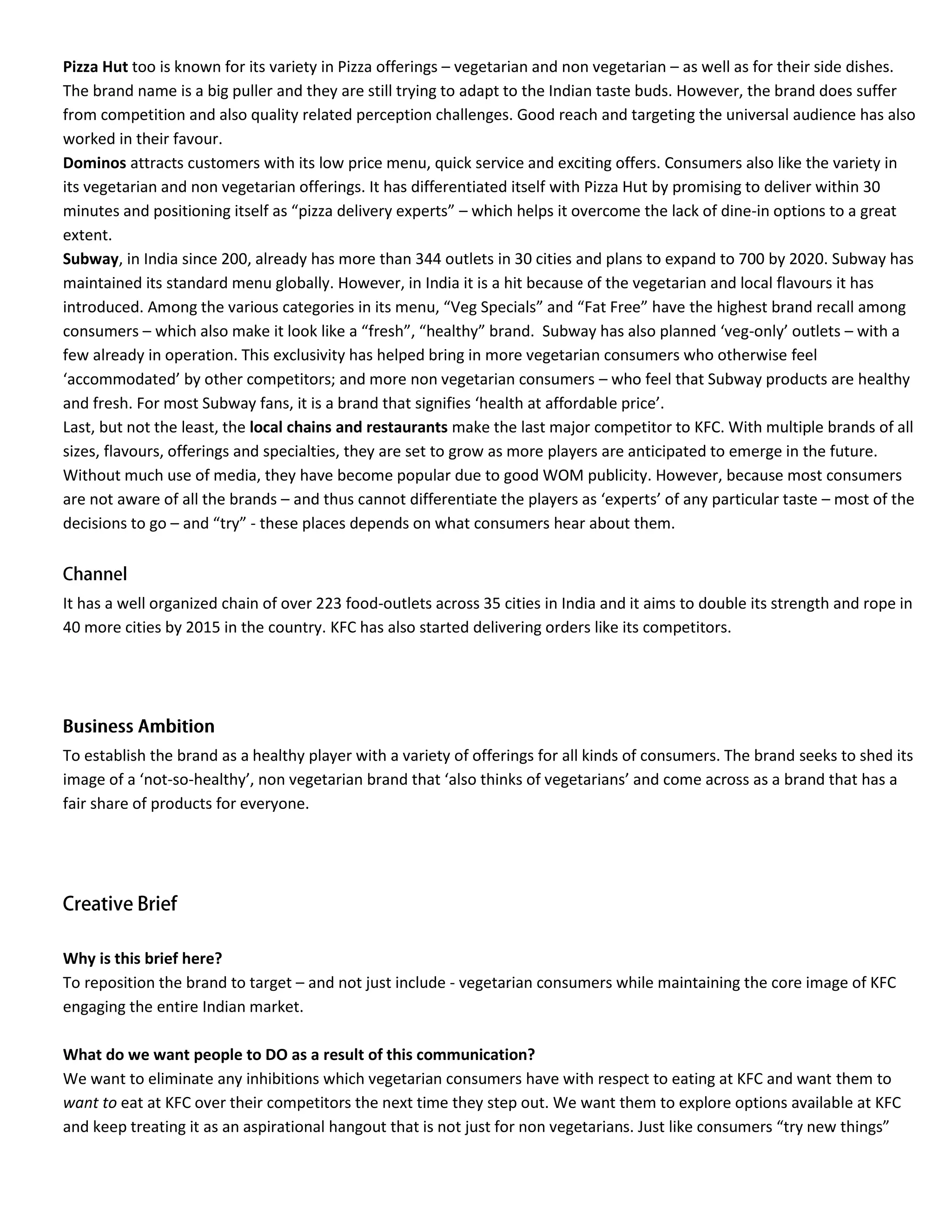 KFC is a global fast food brand known for its chicken offerings. While popular among non-vegetarians in India, its imagery and menu have kept many vegetarian consumers away. However, KFC aims to expand its customer base by repositioning itself as a brand that caters to both vegetarians and non-vegetarians through a variety of healthy offerings. It plans to double its outlets in India and strengthen its presence nationwide by 2015.