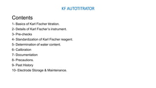 The document outlines the determination of water content using a Karl Fischer (KF) autotitrator, detailing the principles of KF titration, instrument specifications, and standardization procedures. It includes precautions for accurate measurement, such as ensuring proper connections and cleanliness of equipment, as well as methodologies for different sample types. Additionally, it specifies documentation requirements and calibration procedures to ensure reliable results in pharmaceutical analysis.