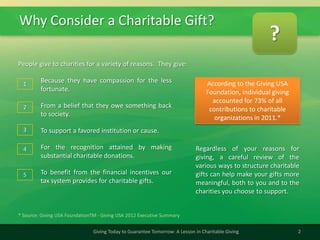 This document discusses various charitable giving techniques and their tax implications. It begins by defining a charitable gift as a donation to a qualified charitable organization for the primary purpose of benefiting the charity. It then discusses different types of charitable gifts one can make during their lifetime or after death through their will or trust. These include outright gifts of cash or property as well as more complex planned giving vehicles like charitable lead trusts, remainder trusts, and gift annuities. The document provides details on deductibility limits, substantiation requirements, and how different techniques can help achieve donor goals like reducing taxes or receiving lifetime income from donated assets.