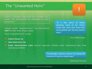 The document discusses estate planning considerations related to unwanted heirs and the federal estate tax. It notes that upon death, assets may not automatically pass to loved ones, as unwanted heirs like taxes may claim a portion. Life insurance can be used to pay estate taxes and costs, protecting more from passing to these heirs. Several case studies and tables show how estates of different sizes may face taxes and shrinkage without proper planning.