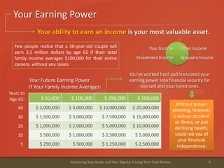 This document provides an overview of long-term care planning and insurance. It begins with introductory information and disclaimers. It then discusses the potential costs of long-term care based on average earnings over a career. Several facts about long-term care needs and costs are presented. Common misconceptions about who pays for long-term care are addressed. The benefits of long-term care insurance for protecting assets are described. Tax treatment of long-term care insurance premiums and benefits is summarized. Considerations for evaluating long-term care insurance policies are outlined. The document concludes by emphasizing the importance of financial management for writing one's life story.