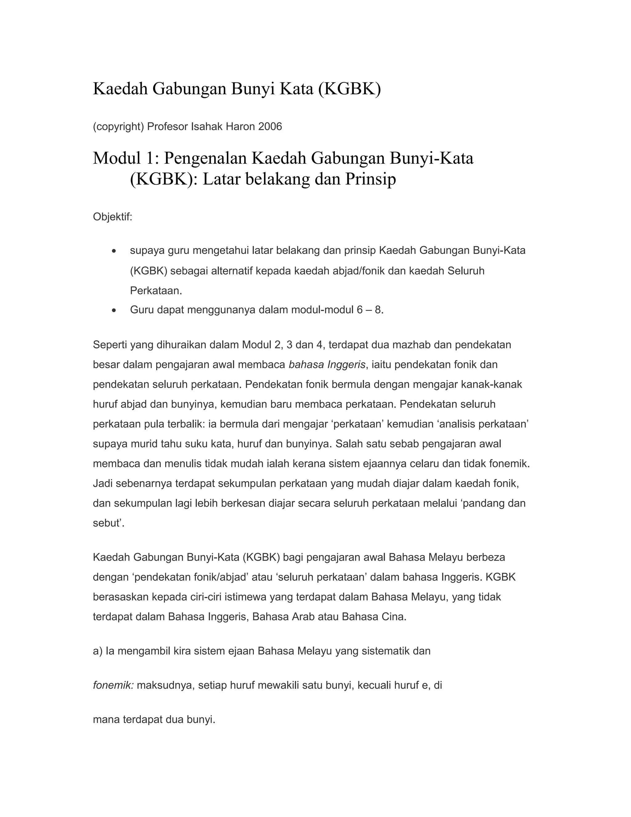 Dokumen tersebut menjelaskan Kaedah Gabungan Bunyi Kata (KGBK) sebagai pendekatan alternatif untuk mengajar membaca Bahasa Melayu kepada kanak-kanak. KGBK menggabungkan pengajaran bunyi huruf dengan membentuk dan membaca perkataan secara serentak dalam satu pelajaran, berbanding pendekatan fonik atau seluruh perkataan. Pendekatan ini membolehkan pembinaan bahan pengajaran secara sistematik dan berturut