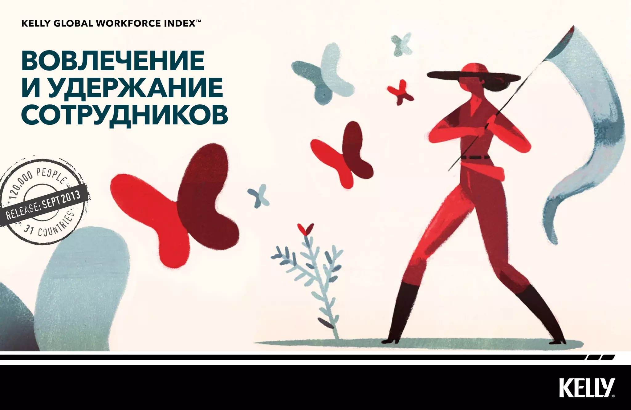 Документ представляет собой глобальное исследование Kelly Global Workforce Index 2013, которое анализирует удовлетворенность сотрудников, вовлеченность и подвижность на рабочем месте среди 120 000 респондентов из 31 страны. Основные результаты показывают, что почти половина опрошенных сменила работодателя в прошлом году, с наивысшими показателями в регионе EMEA, и выявляют важность таких факторов, как корпоративная культура и возможность профессионального развития для улучшения отношений между работником и работодателем. Кроме того, только 29% респондентов готовы рекомендовать своих работодателей, что подчеркивает необходимость изменений в управлении и поддержке сотрудников.